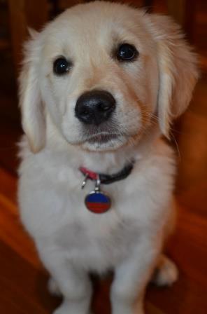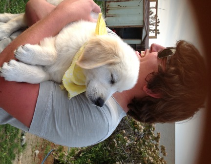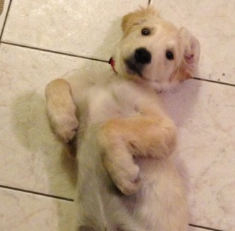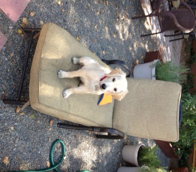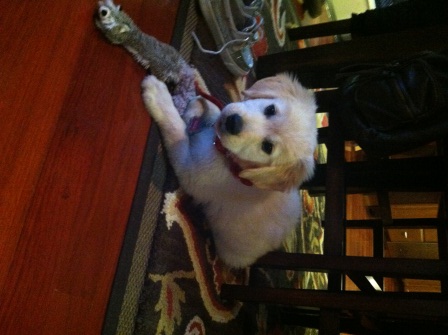 ~AngelAngel is a doll and so very smart. She hasn’t started puppy classes yet, but she wouldn’t think of asking for a treat without sitting. She has “five” down pat. I ask for “five” instead of “paw” because the “five” command is what kids like to ask for. I started “down” and she almost has that one figured out too. She is pretty much house trained with only an occasional piddle inside.