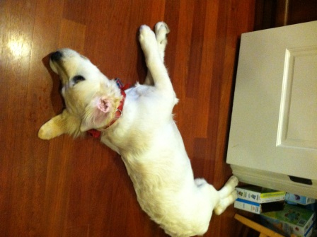 She likes meeting other dogs and people on our walks. She gives people she meets little licks to say hello. She’s wagging her little, stubby tail more now than when she first arrived. She still hasn’t explored all of the rooms of our house. I think it will take awhile for her to be totally comfortable; she’s still sensitive about loud, unexpected noises (yesterday it was a flagpole making noise that spooked her a bit).