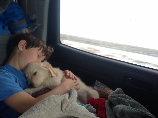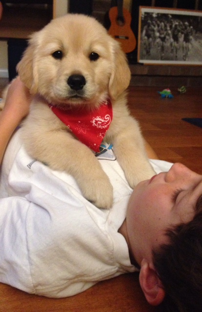 I just wanted to follow-up to tell you what I have intended to tell you Many Many times: We absolutely love and adore our puppy Ollie….He is the center of attention for our children and us parents alike! He is such a source of consistent love, and joy and TOLERANCE and desire to be in good stead with the family. He is so very well mannered and gentle. I just can’t compliment you enough on what an incredible dog you have bred and made in perfect priming attitude for meaningful bonding with our family. Alec walks him five times a day and has a wonderful sense of purpose in his caretaking. And by the way – we did do the crate at night for the first six months but truth be told he now sleeps in bed with our whole family. In short: thank you for our love dog. We are so happy.