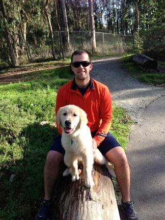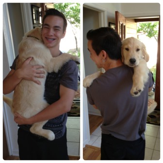 Hi, I am sending some photos of Golden Meadows Jett! I want you to know he is doing so well and we are truly in love with this little guy! He’s enhanced our lives so much. Yesterday, he went to dog beach and followed another Golden and kids into the ocean! He had a blast and so did we. He’s going to really love the water. We could tell. Kids come up to him and hug him all the time. He loves them and is so calm and gentle. We continue to work on manners, but he’s made such progress that we just can’t get over how quickly he’s learned. He does “talk back” at us when we say “wrong” and this makes it hard to not laugh! but we do our best. Fortunately, we don’t have to say it very often! He has such a personality, you would be proud of him, I’m sure.