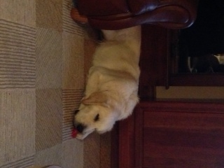 She LOVES walking in our neighborhood. She is always ready to go for a walk. Twice now she’s gone to the bathroom on our walks. She very much likes to be with our two other goldens although naughty Noomi thinks it’s fun to sneak away with her stuffies. Riley has a stockpile of the stuffies she likes under our kitchen table.