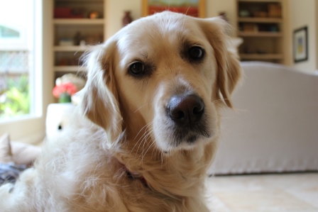 As you can see, Luc is a big guy, but we really restrict his diet and he gets tons of exercise — so I think his size is just in the cards. He’s very much like our prior “giant Golden” Banner … so there must be a jumbo-size gene lurking somewhere in his bloodline . (I love his enormous blocky head…. especially when he comes over and plops it in my lap ).